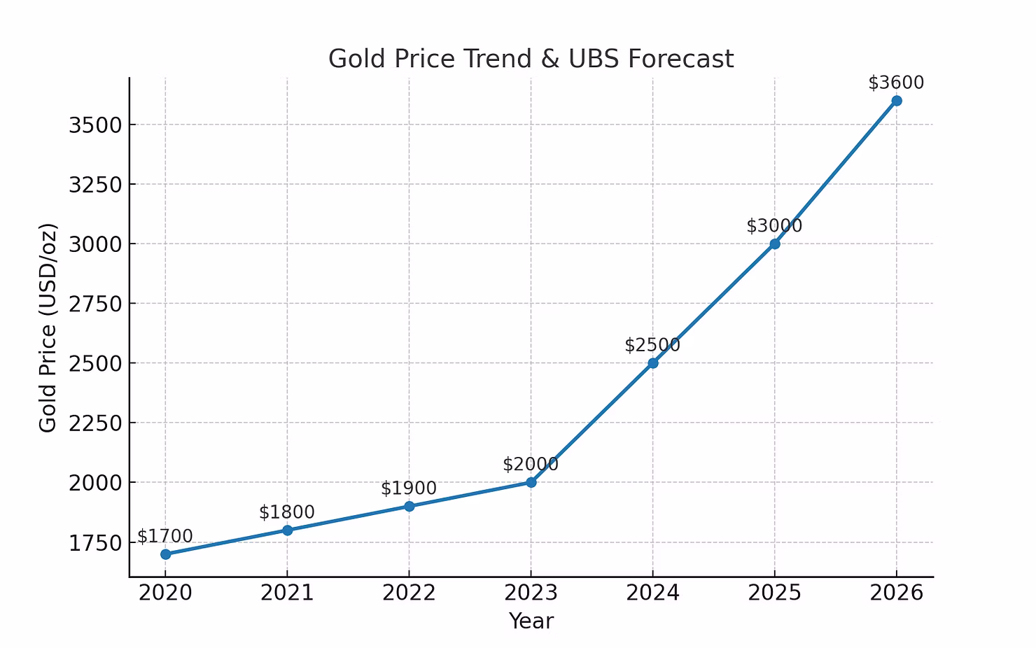 A timeline showing Gold prices 2020 → 2025, with UBS’s new forecast line pointing up to $3,600+ by 2026.